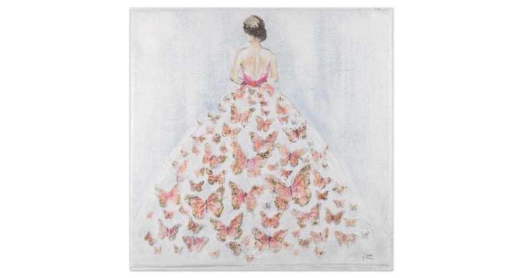 Mit dem handgemalten Acrylbild in zartem Blau werden Prinzessinnenträume wahr: Unzählige Schmetterlinge schmücken das rosa Ballkleid der jungen Frau, die sich auf dem Weg zum 'Schmetterlingsball' befindet. Träumen Sie sich in die Rolle der Schönheit und lassen Sie sich gedanklich in Ihrem Wohnzimmer zu einem rauschenden Fest entführen. Ihr handgemaltes Gemälde erhalten Sie in der Größe 80x80cm. Anders als bei minderwertigen Drucken auf Leinwand können Sie auf unseren Unikaten jeden Pinselstrich fühlen.