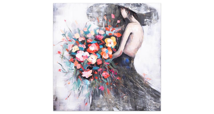 Mit einer Dame im schwarzen Kleid und üppigem Blumenstrauß in den Händen zeigt dieses Acrylgemälde die weibliche Schönheit. Handgemalte Blüten in Nuancen von Rosa kontrastieren mit der Bräune ihres Teints und heben ihre Attraktivität in einfacher Pose hervor. Verleihen Sie Ihrem Wohnzimmer mit 'Flower Girl' einen Hauch von purer Eleganz. Ihr handgemaltes Gemälde erhalten Sie in der Größe 80x80cm. Anders als bei minderwertigen Drucken auf Leinwand können Sie auf unseren Unikaten jeden Pinselstrich fühlen.
