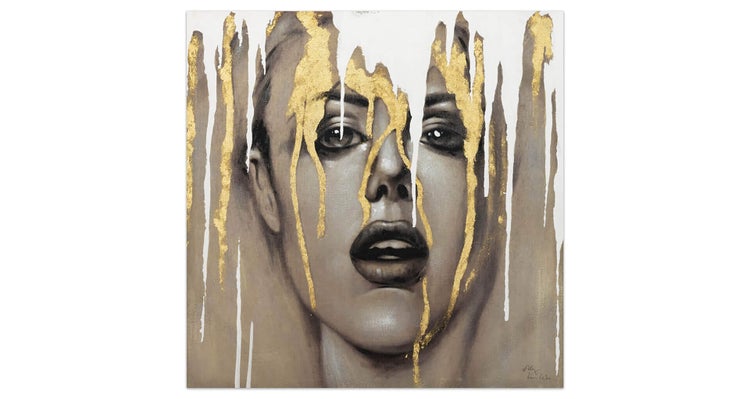 Behind the Curtain' zeigt das Gesicht einer Frau auf einem Hintergrund in Taupe, mit feinem Goldglanz und elegantem Weiß. Mit eindringlichen Augen und leicht offenem Mund sucht die handgemalte Frau Ihre Blicke, um Sie in den Bann der Verführung zu ziehen. Dieses Acrylgemälde verleiht Ihrem Wohnzimmer ein Hauch von Schönheit mit moderner Kunst. Ihr handgemaltes Gemälde erhalten Sie in der Größe 80x80cm. Anders als bei minderwertigen Drucken auf Leinwand können Sie auf unseren Unikaten jeden Pinselstrich fühlen.