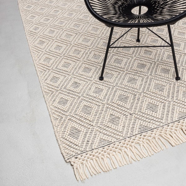 Das schlichte Handwebdesign dieses Wollteppichs im Macrame Style erhält durch den Hoch-Tiefeffekt im Gewebe seinen ganz besonderen Look. Der neutrale Wollton wird durch ein helles Grau perfekt ergänzt. Eine weitere Besonderheit sind die kunstvoll geknoteten Fransen, die als Abschlusskante für einen zusätzlichen Hingucker sorgen. Ausschließlich aus Naturmaterialien gearbeitet, passt dieser Teppich hervorragend zum angesagten Nordic Style, integriert sich aber auch ebenso gut in viele andere Raumkonzepte. Seine neutralen Farbtöne ermöglichen zudem die Kombination mit fast jedem Farbkonzept. Die Schurwolle gibt dem Teppich seine Weichheit. In Kombination mit der eingearbeiteten Baumwolle wird dieser Teppich zu einem strapazierfähigen Teppich, der für die Fußbodenheizung geeignet ist. Ob im Wohnzimmer oder im Schlafbereich, durch seinen weichen Griff und seine natürliche Farbigkeit passt er sich dem Interieur gut an. Kombiniert man ihn mit einem Sitzkissen wird er zum echten Kuschelplatz.