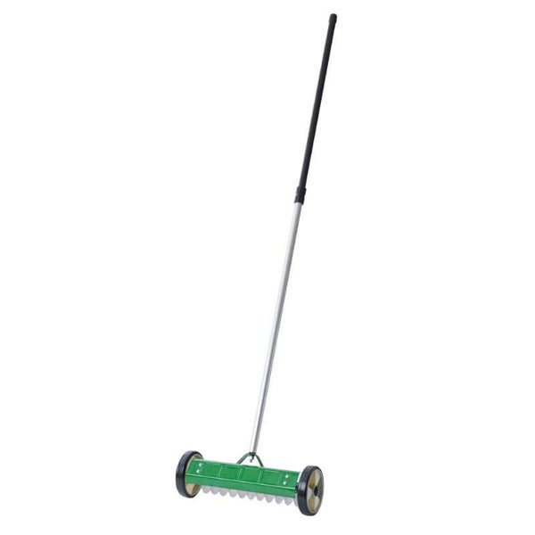 Der Handvertikutierer ist mit 11 pendelnd gelagerten Messern aus rostfreiem Stahl ausgestattet. Er entfernt Moos und Rasenfilz effektiv aus Rasenflächen und dient ideal zur regelmäßigen Bodenlockerung und -belüftung. Mit den Rädern lässt sich der manuelle Vertikutierer kraftsparend bewegen. Der mitgelieferte Stiel aus Aluminium ist 180 cm lang und hat einen weichen und rutschhemmenden Griff mit Aufhängevorrichtung.