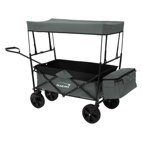 Hauki Bollerwagen L faltbar mit Dach, Grau, Handwagen klappbar, Transportwagen für Kinder, Gerätewagen inkl. 2x Netztaschen und 1x Außentasche, Vorderrad-Bremse, bis 80 kg, Transportkarre Kinderwagen