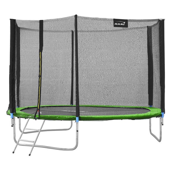 Hauki Trampolin Outdoor, Ø305 cm, Grün, GS geprüft, Rundes Gartentrampolin für Kinder bis 150 kg, Komplettset mit Sicherheitsnetz, Leiter, Randabdeckung, Gepolsterte Stangen, Stabile Kindertrampolin