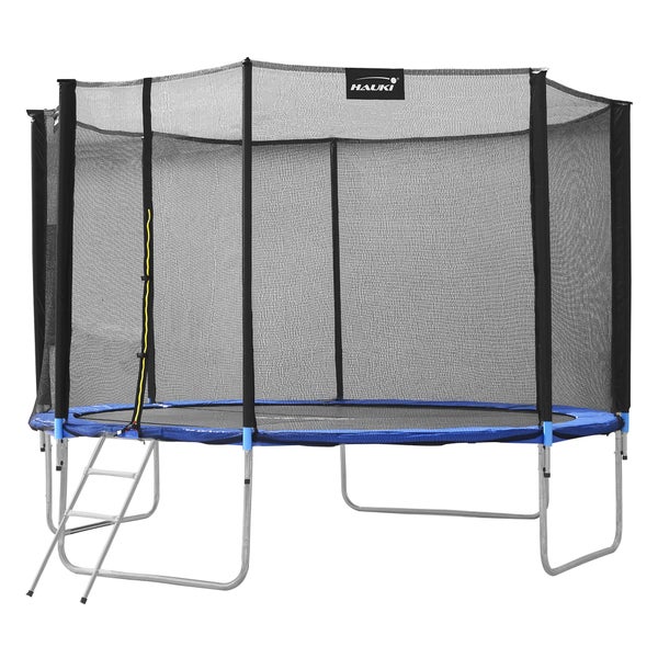 Hauki Trampolin Outdoor, Ø427 cm, Blau, GS geprüft, Rundes Gartentrampolin für Kinder bis 150 kg, Komplettset mit Sicherheitsnetz, Leiter, Randabdeckung, Gepolsterte Stangen, Stabile Kindertrampolin