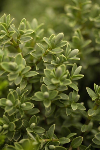 Hebe topiaria, die immergrüne Strauchveronika, ist ein kompakter Zierstrauch mit schönem, dichten Kugelwuchs und feinem, graugrün bis silbrig schimmerndem Laub, das das ganze Jahr über Struktur verleiht. Botanisch überzeugt diese Hebe durch ihr präzises, polsterartiges Erscheinungsbild, das an einen natürlich geformten Formschnitt erinnert und sich ideal für geometrische Effekte im Garten eignet. Im Sommer erscheinen kurze, zarte weiße Blütenähren, die den Blütenstrauch dezent schmücken, ohne die elegante Blattstruktur zu überlagern. Als vielseitiger Gartenstrauch passt Hebe topiaria in moderne Architekturbeete ebenso wie in den Steingarten, den Vorgarten oder das Staudenbeet und wirkt als Solitär auf der Terrasse im Kübel ebenso stilsicher wie in niedrigen Gruppenpflanzungen oder als niedrige Heckenpflanze entlang von Wegen. Am besten gedeiht sie an einem sonnigen bis halbschattigen, warmen Standort in durchlässigem, eher sandig-kiesigem Boden; Staunässe sollte vermieden werden, denn gute Drainage ist entscheidend für Vitalität und Winterhärte. In rauen Lagen empfiehlt sich ein geschützter Platz, während im Gefäß ein leichter Winterschutz ratsam ist. Die Pflege ist unkompliziert: gleichmäßiges, maßvolles Gießen, sparsame Düngung im Frühjahr und ein leichter Rückschnitt nach der Blüte erhalten die dichte, kugelige Form. Mit ihrem ruhigen Wuchs von etwa mittlerer Geschwindigkeit und ihrer klaren Silhouette setzt diese Kübelpflanze und Beetstrukturpflanze das ganze Jahr über hochwertige Akzente.