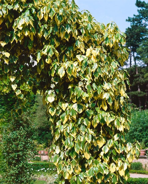 Hedera colchica ‘Dentata Variegata’, der Persische Efeu, ist eine eindrucksvolle, immergrüne Kletterpflanze mit großen, ledrigen Blättern, deren breite, cremeweiße Randzeichnung elegante Akzente setzt. Die dekorativ gezähnten, dunkelgrünen Blätter sorgen das ganze Jahr über für Struktur und Farbe und machen diese Rankpflanze zur stilvollen Wahl für Fassadenbegrünung, Zäune, Mauern und Pergolen. Mit seinem zügigen, dicht verzweigten Wuchs erklimmt der Efeu mithilfe von Haftwurzeln raue Oberflächen oder bildet als robuster Bodendecker geschlossene, pflegeleichte Teppiche unter Gehölzen. Auf älteren Pflanzen erscheinen im Spätsommer unauffällige, grünliche Blütenstände, die die Zierwirkung dezent ergänzen.
