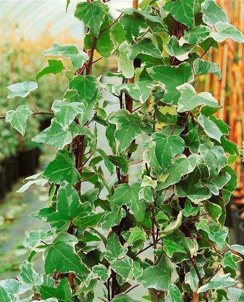 Hedera helix ‘Glacier’, der panaschierte Gemeine Efeu, überzeugt als immergrüne Kletterpflanze mit elegantem, graugrünem Laub und cremeweißen Blatträndern. Die kleinen, gelappten Blätter bringen eine frische, helle Struktur in Beete und auf Terrassen und setzen ganzjährig dekorative Akzente. Als selbstklimmende Rankpflanze haftet dieser Efeu mit feinen Haftwurzeln an Rankhilfen, Mauern und Zäunen, eignet sich aber ebenso hervorragend als dichter Bodendecker, der schnell attraktive, pflegeleichte Teppiche bildet. Die unauffällige, grünlich-gelbe Blüte erscheint meist von Spätsommer bis Herbst und steht im reizvollen Kontrast zum dekorativen Laub, das auch im Winter seine Farbe behält.