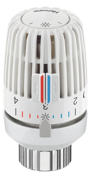 HEIMEIER Thermostat-Kopf zur Montage an Ventilheizkörpern mit Thermostat-Oberteil für Klemmverbindung und Danfoss RA Ventile. Mit eingebautem Fühler. Skalenhaube weiß. Flüssigkeitsgefüllter Thermostat.Stabiles Regelverhalten auch bei kleinen Auslegungsregeldifferenzen (<1 K). Entspricht EnEV bzw. DIN V 4701-10. Obere und untere Begrenzung bzw. Markierung des Temperaturbereiches oder Blockierung einer Einstellung durch zwei Sparclips. Verdeckte obere und untere Begrenzung des Temperaturbereiches oder Blockierung einer Einstellung durch Anschlagclips. Stirnseitige Einstellhilfe und erfühlbare Markierungen für Sehbehinderte. Drehrichtungsanzeige und Symbole für Grundeinstellung und Nachtabsenkung. Kurzinformation mit den wichtigsten Einstellungen. Sollwertbereich 6 bis28 Grad C. Merkzahl 1-5. Mit Nullstellung (Ventil öffnet bei ca. 0 Grad C).Frostschutzsicherung.