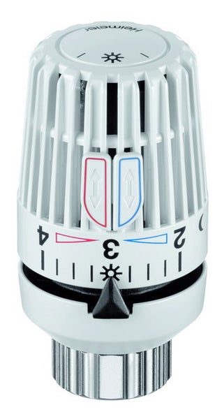 HEIMEIER Thermostat-Kopf zur Montage an Ventilheizkörpern mit Thermostat-Oberteil für Klemmverbindung und Danfoss RA Ventile. Mit eingebautem Fühler. Skalenhaube weiß. Flüssigkeitsgefüllter Thermostat. Stabiles Regelverhalten auch bei kleinen Auslegungsregeldifferenzen (<1 K). Entspricht EnEV bzw. DIN V 4701-10. Obere und untere Begrenzung bzw. Markierung des Temperaturbereiches oder Blockierung einer Einstellung durch zwei Sparclips.