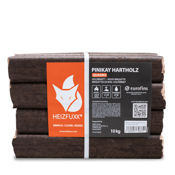 Die HEIZFUXX® PiniKay Hartholzbriketts überzeugen durch Form, Funktion und Umweltbewusstsein. Ihre charakteristische viereckige Form mit mittigem Zugloch sorgt für optimale Luftzirkulation, ein kraftvolles Flammenbild und schnelles Anheizen. Die hohe Energiedichte garantiert eine langanhaltende, gleichmäßige Wärme – ideal für Kaminofen, Feuerschale, Holzvergaser oder andere Festbrennstoffanlagen. Unsere Briketts bestehen zu 100 % aus naturbelassenen Hartholzspänen, gewonnen aus Sägewerksresten. In einem aufwendigen Pressverfahren wird das im Holz enthaltene Lignin aktiviert – es wirkt als natürlicher Binder und macht Klebstoffe überflüssig. So entsteht ein besonders festes, schadstofffreies Brikett mit minimaler Aschebildung und sauberem Abbrand. Die HEIZFUXX® PiniKay Briketts erfüllen höchste Qualitätsstandards in Bezug auf Reinheit, Heizwert und Nachhaltigkeit. Sie erhalten einen umweltfreundlichen Brennstoff aus unbehandeltem Holz – garantiert frei von Zusatzstoffen, Farben oder Lacken. Besonders gut eignen sich die Brennstäbe auch zur Nutzung in Feuerschalen. Dafür empfiehlt sich der Aufbau eines kleinen Turms aus mehreren Schichten – entzündet mit Anzündholz entsteht ein besonders angenehmes Flammenbild. Die PiniKay Briketts sind die richtige Wahl für alle, die nachhaltiges Heizen mit hoher Effizienz verbinden möchten.