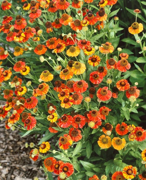 Helenium x cult. ‘Red Army’, die Sonnenbraut ‘Red Army’, ist eine ausdrucksstarke Blütenstaude für sonnige Gartenplätze. Ihre zahlreichen, samtig roten bis kupferrot schimmernden Strahlenblüten um ein dunkelbraun-gelbes Körbchen setzen von Juli bis September, oft bis in den Oktober, leuchtende Akzente. Das frischgrüne, lanzettliche Laub bildet einen dichten, horstigen Busch mit aufrechtem, gut verzweigten Wuchs, der je nach Standort standfest bleibt und eine harmonische Silhouette im Beet schafft. Als Gartenstaude und Zierstaude überzeugt ‘Red Army’ in Rabatten, Präriebeeten und Bauerngärten ebenso wie im Vorgarten; sie eignet sich für Gruppenpflanzungen, als Solitär im Staudenbeet und als attraktive Kübelpflanze auf Terrasse oder Balkon. Besonders wirkungsvoll wirkt sie in Kombination mit Ziergräsern, Echinacea, Rudbeckia, Salvia oder Herbstastern, wo sie als Spätsommerblüher farbige Übergänge schafft. Ein vollsonniger, warmer Standort fördert eine reiche Blüte; der Boden sollte humos, nährstoffreich, durchlässig und gleichmäßig frisch bis mäßig feucht sein. Staunässe wird gemieden, regelmäßiges Gießen in Trockenphasen erhält die Vitalität. Ein Rückschnitt nach der Blüte oder das Ausputzen verblühter Köpfe verlängert die Blühdauer, eine moderate Düngung im Frühjahr unterstützt den Austrieb. Für einen kompakten, standfesten Wuchs kann ein früher Rückschnitt im Juni sinnvoll sein. Alle drei bis vier Jahre lässt sich die Staude teilen und verjüngen, wodurch sie vital bleibt und ihre Blühkraft dauerhaft entfaltet. Als Schnittblume bringt ‘Red Army’ zudem kräftige Spätsommerfarben in die Vase.