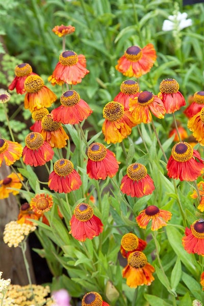 Helenium x cultorum ‘Sahin’s Early Flowerer’, die Sonnenbraut, ist eine leuchtstarke Gartenstaude, die mit warmen Tönen von Goldgelb über Apricot bis Kupferorange begeistert. Die reich verzweigten Blütenstände zeigen über Wochen hinweg farbwechselnde Zungenblüten um eine dunkelbraune Mitte und sorgen von Frühsommer bis in den Herbst für eine kontinuierliche Blütezeit, ideal als Blütenstaude für Beet, Rabatte und Bauerngarten. Der aufrechte, buschige Wuchs formt dichte Horste, die je nach Standort 80 bis 120 cm erreichen und als Solitär ebenso überzeugen wie in einer harmonischen Gruppenpflanzung mit Gräsern und spät blühenden Stauden. Auch als robuste Beetstaude für Präriebeete oder als üppige Kübelpflanze auf sonniger Terrasse setzt sie starke Farbakzente und eignet sich zugleich gut als Schnittblume für die Vase.
