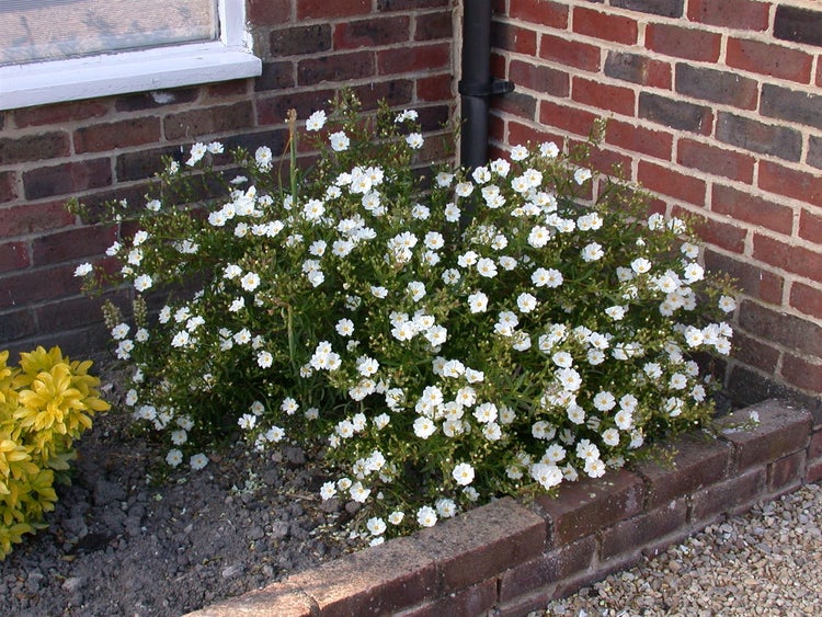 Das Sonnenröschen liebt einen warmen, vollsonnigen Standort und gut durchlässige, eher magere, sandig-kiesige bis kalkhaltige Böden; Staunässe sollte vermieden werden, da die Wurzeln trockenheitsverträglich, aber nässeempfindlich sind. Ein moderater Rückschnitt direkt nach der Hauptblüte fördert die Vitalität, verhindert das Verholzen und begünstigt eine erneute Blütenbildung. Dank der flachen, breiten Wuchsform von etwa 10–20 cm Höhe und 30–50 cm Breite ist Helianthemum ‘Eisbär’ ein idealer Zierstrauch-Ersatz im niedrigen Bereich, eine unkomplizierte Gartenstaude für sonnige Lagen und eine langlebige, robuste Wahl für Steingärten, Dachgärten, Böschungen und den Beetvordergrund, wo es seine helle, klare Wirkung zuverlässig entfaltet.