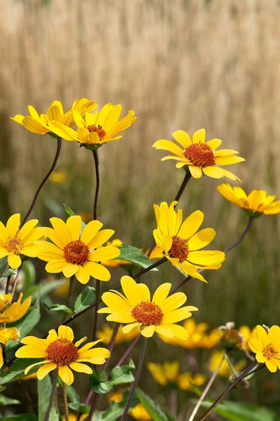 Heliopsis helianthoides ‘Summer Nights’, das Sonnenauge, ist eine langlebige, reichblühende Gartenstaude, die mit leuchtend goldgelben Blüten und kontrastreich dunkel gefärbten Stielen sofort ins Auge fällt. Die Sorte präsentiert von Hochsommer bis in den Herbst hinein eine Fülle strahlenförmiger Körbchenblüten mit warmem, orange-rot getöntem Zentrum und setzt damit in Staudenbeet, Rabatte und Präriepflanzung starke Akzente. Das frischgrüne, leicht bronzeschimmernde Laub unterstreicht den aufrechten, buschigen Wuchs, der der Blütenstaude zugleich Standfestigkeit und Struktur verleiht. Als Solitär im Vorgarten, in Gruppenpflanzung mit Ziergräsern, Echinacea oder Salvia oder als prägnanter Sommerblüher im Bauerngarten wirkt das Sonnenauge besonders harmonisch; auch im großen Kübel auf Terrasse und Balkon entfaltet die pflegeleichte Kübelpflanze ihren Charme und liefert zudem ausgezeichnete Schnittblumen für die Vase.