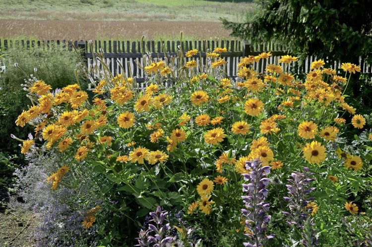 Am besten gedeiht Heliopsis scabra ‘Venus’ an einem vollsonnigen, warmen Standort auf durchlässigem, humosem Gartenboden, der frisch bis mäßig trocken sein darf. Nach dem Anwachsen ist die Staude erstaunlich genügsam, regelmäßige Wassergaben in längeren Trockenphasen sowie eine maßvolle Nährstoffversorgung im Frühjahr fördern jedoch Vitalität und Blühfreude. Das Ausputzen verwelkter Blüten verlängert die Blütezeit, ein Rückschnitt bodennah erfolgt erst im Spätwinter. Besonders schön wirkt ‘Venus’ in Kombination mit Gräsern wie Pennisetum oder Miscanthus sowie mit anderen Sommerstauden wie Salvia, Echinacea oder Rudbeckia, wo ihr warmes Goldgelb für harmonische, lang anhaltende Farbspiele sorgt und Beete bis in den Herbst hinein strukturiert.