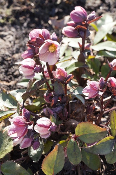 Helleborus x ballardiae Pink Frost, die edle Christrose beziehungsweise Lenzrose, ist eine immergrüne Gartenstaude, die mit frühzeitiger Blüte im Spätwinter bis weit in den Frühling hinein begeistert. Die schalenförmigen Blüten öffnen sich zunächst zart rosa bis silbrig-rosa, vertiefen sich im Verlauf zu kräftigem Purpur und behalten ihren Zierwert über Wochen, während goldgelbe Staubgefäße für einen eleganten Kontrast sorgen. Das ledrige, attraktiv gezeichnete Laub ist ganzjährig dekorativ, dunkelgrün mit oft leicht rötlicher Tönung, und unterstreicht den aparten, kompakt-buschigen Wuchs von etwa 40 bis 50 Zentimetern Höhe. Pink Frost wirkt als Solitär im Halbschatten, setzt im Staudenbeet, im Vorgarten oder am Gehölzrand wirkungsvolle Akzente und eignet sich hervorragend als Kübelpflanze für Terrasse und Hauseingang. In Gruppenpflanzung mit frühen Zwiebelblühern und schattenliebenden Begleitern entsteht ein harmonischer, langlebiger Ziergarten. Bevorzugt werden durchlässige, humose, frische bis mäßig trockene Böden ohne Staunässe; ein Standort in absonniger bis halbschattiger Lage ist ideal. Leichte Kalktoleranz, hohe Winterhärte und eine zuverlässige, horstige Wuchsform machen die Pflege unkompliziert: Im Spätwinter ältere, unschöne Blätter entfernen, um den neuen Austrieb und die Blüten besser zur Geltung zu bringen, und im Frühjahr mit etwas Kompost versorgen. Auch als Schnittblume für langlebige Wintersträuße geeignet, verleiht Helleborus Pink Frost dem Blütenstrauch- und Staudenarrangement im Garten zeitlose Eleganz und verlängert die Saison eindrucksvoll.