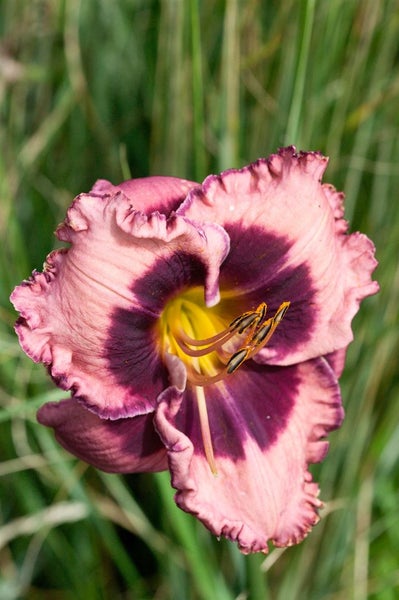 Hemerocallis x cult. ‘Daring Deception’, die edle Taglilie, verbindet extravagante Blütenzeichnung mit zuverlässiger Gartenleistung und bereichert als langlebige Zierstaude jedes Beet. Ihre auffälligen, samtigen Blüten zeigen ein harmonisches Spiel aus rosavioletten bis lavendelfarbenen Tepalen, einem kontrastierenden purpurfarbenen Auge und grünlicher Kehle; leicht gewellte Ränder unterstreichen die elegante Wirkung. Die Blütezeit erstreckt sich je nach Witterung von Juni bis August, oft mit einer zweiten, schwächeren Nachblüte. Jede einzelne Blüte hält nur einen Tag, doch zahlreiche Knospen sorgen fortlaufend für frischen Flor. Das grasartige, sommergrüne Laub bildet dichte Horste, der Wuchs ist kompakt, aufrecht und bestens standfest.