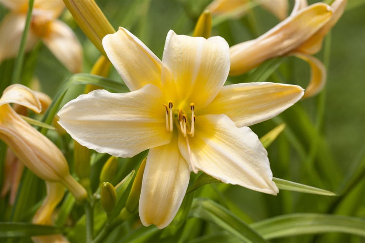 Hemerocallis x cultorum ‘Frances Fay’, die elegante Taglilie, begeistert als robuste, langlebige Staude mit harmonischem Erscheinungsbild und reicher Blütenpracht. Ihre großen, trichterförmigen Blüten in zartem Creme- bis Zitronengelb mit frischgrünem Schlund und leicht gewelltem Rand öffnen sich zuverlässig über viele Wochen von Juni bis August, oft mit williger Nachblüte. Das bogig überhängende, grasartige Laub bildet dichte Horste und setzt als Beetstaude einen ruhigen, strukturbildenden Akzent, während der aufrechte Blütenflor auf etwa 60–80 cm Höhe einen leuchtenden Blickfang schafft. Als Solitär im Vorgarten, in der Gruppenpflanzung im Staudenbeet, entlang von Wegen oder in einer gemischten Rabatte mit Ziergräsern, Phlox, Rudbeckia oder Salvia zeigt der Blütenstrauch-Charakter dieser Gartenstaude ihre volle Wirkung; selbst als größer dimensionierte Kübelpflanze auf Terrasse oder Balkon überzeugt sie mit unkomplizierter Pflege. Ein sonniger Standort fördert die üppigste Blüte, doch kommt ‘Frances Fay’ auch mit lichtem Halbschatten zurecht. Bevorzugt wird ein durchlässiger, humoser, mäßig nährstoffreicher Boden mit gleichmäßiger Feuchte; nach der Etablierung übersteht die Taglilie auch kurze Trockenphasen. Eine Frühjahrsgabe organischer Nährstoffe, gelegentliches Mulchen und regelmäßiges Ausputzen verblühter Blütenstände unterstützen den Flor, während eine Teilung der Horste alle paar Jahre die Vitalität erhält. Dank ihrer horstbildenden Wuchsform bleibt sie formstabil, bedeckt den Boden zuverlässig und sorgt saisonal für ein gepflegtes Bild – ideal für naturnahe Beete, klassische Staudenrabatten und repräsentative Pflanzungen rund ums Haus.