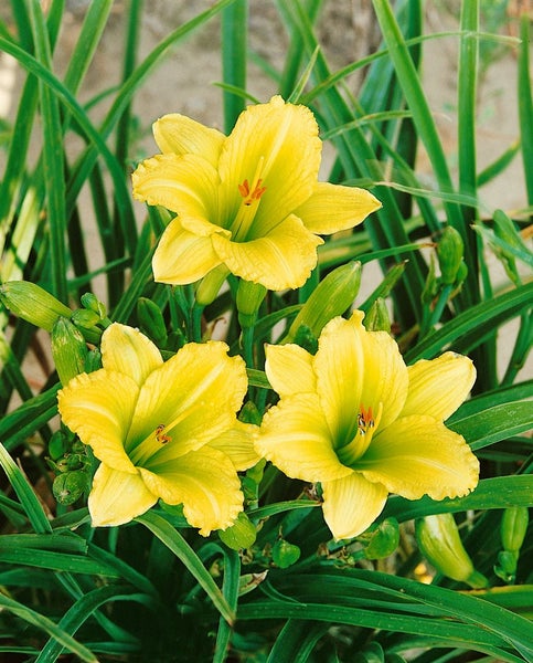 Hemerocallis x cult. ‘Green Flutter’, die Taglilie ‘Green Flutter’, begeistert als elegante Staude mit frisch limonengelben bis grünlich-gelben Blüten, die mit zart gewelltem Rand und klarer Mitte einen modernen Akzent im Garten setzen. Die aufrechten, stabilen Blütenstiele erheben sich über bogig-überhängendes, grasartiges Laub, wodurch ein harmonischer Kontrast aus Struktur und Farbe entsteht. Die reichknospigen Blüten erscheinen je nach Witterung von Juni bis August in Folge und bieten über Wochen hinweg immer neue Highlights im Staudenbeet. Der horstige, kompakte Wuchs macht diese Taglilie zu einer vielseitigen Beetstaude für Rabatten, den Vorgarten oder als dezente Kübelpflanze auf Terrasse und Balkon; ebenso wirkt sie als Solitär im Gartenbild wie auch in Gruppenpflanzungen neben Ziergräsern und anderen Blütenstauden ausgesprochen stimmig. ‘Green Flutter’ bevorzugt einen sonnigen bis halbschattigen Standort auf durchlässigem, humosem und gleichmäßig frischem Boden; kurzzeitige Trockenphasen werden nach der Etablierung gut toleriert, dennoch fördert regelmäßiges Gießen in der Anwuchszeit eine üppige Blütenbildung. Eine moderate Nährstoffversorgung im Frühjahr und ein Rückschnitt des eingetrockneten Laubs vor dem Austrieb halten die Pflanze vital und blühfreudig, während eine Teilung alle paar Jahre den Horst verjüngt und die Vitalität steigert. Mit einer Endhöhe von etwa 60 bis 80 cm und einem Breitenwachstum von rund 40 bis 60 cm fügt sich diese klassische Gartenstaude mühelos in Mischpflanzungen ein und liefert zugleich einen klaren, frischen Farbton, der sowohl mit pastelligen als auch kräftigen Partnern hervorragend harmoniert.