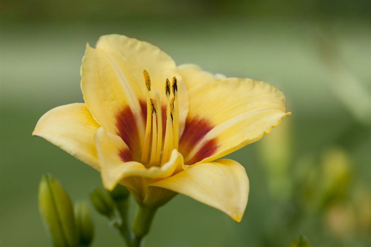 Hemerocallis x cult. ‘Little Cadet’, die kompakte Taglilie, überzeugt als robuste Gartenstaude mit eleganter Präsenz. Die Sorte präsentiert zahlreiche trichterförmige Blüten in leuchtendem Gelb mit zartem rötlichem Auge und grünlicher Kehle, die sich über Wochen hinweg von Juni bis August öffnen und den Zierwert im Staudenbeet deutlich erhöhen. Das bogig überhängende, grasartige Laub bildet dichte, horstige Büsche, die etwa 30 bis 40 cm hoch werden und eine harmonische, aufrechte Wuchsform zeigen, ideal für den Vordergrund und als niedriger Strukturgeber. Als vielseitige Zierpflanze eignet sich ‘Little Cadet’ für Beet und Rabatte, den Vorgarten, Steingarten sowie als Kübelpflanze auf Terrasse und Balkon; in Gruppenpflanzungen wirkt sie besonders geschlossen, als kleiner Solitär setzt sie prägnante Farbakzente entlang von Wegen oder am Sitzplatz. Ein sonniger Standort fördert die reichste Blüte, leichter Halbschatten wird gut toleriert. Der Boden sollte durchlässig, humos und gleichmäßig frisch sein; kurzzeitige Trockenheit wird nach Einwachsen gut vertragen, Staunässe hingegen gemieden. Pflegeleicht in der Kultur genügt das regelmäßige Entfernen verwelkter Blütenstängel, um neue Knospen zu fördern; eine Teilung älterer Horste alle paar Jahre erhält Vitalität und Blühfreude. In Kombination mit Ziergräsern, Lavendel, Katzenminze oder niedrigeren Blütensträuchern entsteht ein stimmiges Bild, das Struktur und Farbe verbindet. Hemerocallis ‘Little Cadet’ ist eine langlebige, unkomplizierte Staude für Garten und Kübel, die mit zuverlässiger Blüte und kompaktem Wuchs vielseitige Gestaltungsmöglichkeiten eröffnet.