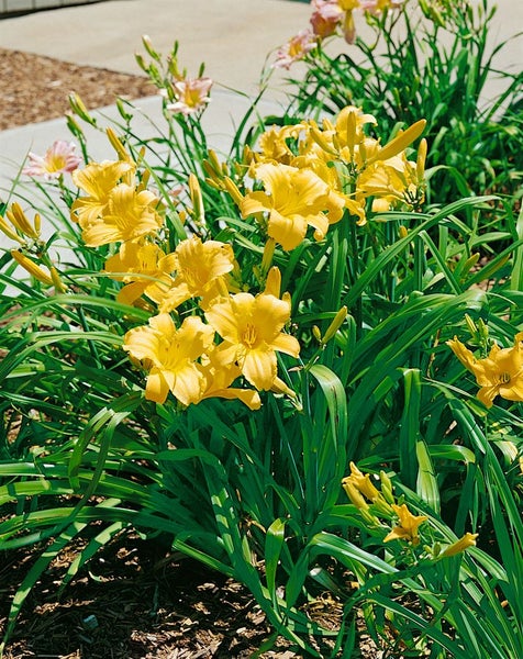 Die Taglilie Hemerocallis x cultorum ‘Mary Todd’ ist eine bewährte Gartenstaude, die mit ihren großen, leuchtend goldgelben Blüten jeden Ziergarten bereichert. Die elegant trompetenförmigen, leicht gerüschten Blüten erscheinen zuverlässig von Juni bis in den August hinein und öffnen sich in Serie, sodass der Blütenstrauch-Effekt über Wochen anhält. Das frischgrüne, schmal bandförmige Laub bildet dichte, horstige Büsche und setzt einen attraktiven, grasartig-architektonischen Akzent. Mit einer Wuchshöhe von etwa 60–70 cm wächst ‘Mary Todd’ kompakt-aufrecht und bleibt formschön, wodurch sie sich gleichermaßen für das Staudenbeet, den Vorgarten, gemischte Rabatten und als Solitär eignet; in größeren Gefäßen macht sie zudem eine gute Figur als pflegeleichte Kübelpflanze auf Terrasse oder Balkon.