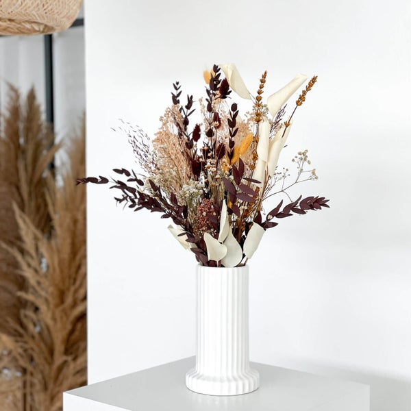 Der Trockenblumenstrauß mit Eukalyptus und Glixia steht einem frischen Strauß in nichts nach. Die Trockenblumen Kombination mit Phalaris, Schleierkraut und Lavendel sind eine tolle Ergänzung zu den klassischen Must have wie Eukalyptus und Pampasgras. Das Palmblatt gibt dem Herbststrauß aus Trockenblumenstauss das gewisse Extra.
