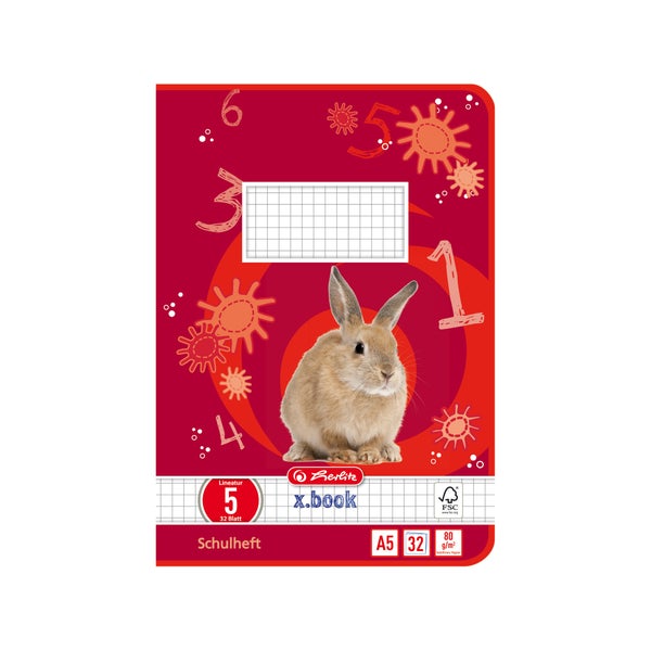 Schulheft. Ausführung Papier: holzfreies Papier, FSC Mixed, CO2 reduziert, 80 g/m². Ausstattung: keine Lochung, geklammert. 1 Motiv. Papierformat: A5. Lineatur/Lineatur-Nr.: kariert 5mm, 05. Anzahl der Blätter: 32 Blatt. Farbe des Einbandes: Motiv Hase. Inhalt: 1 Stück