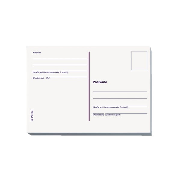 Holzfreier Offsetkarton, Kartonstärke: 170g/m², Maße: 14,8 x 10,5 cm; Vorderseite 1-farbig bedruckt mit Anschrift/Absender, Farbe: weiß, Inhalt: 20 Stück, geblockt.