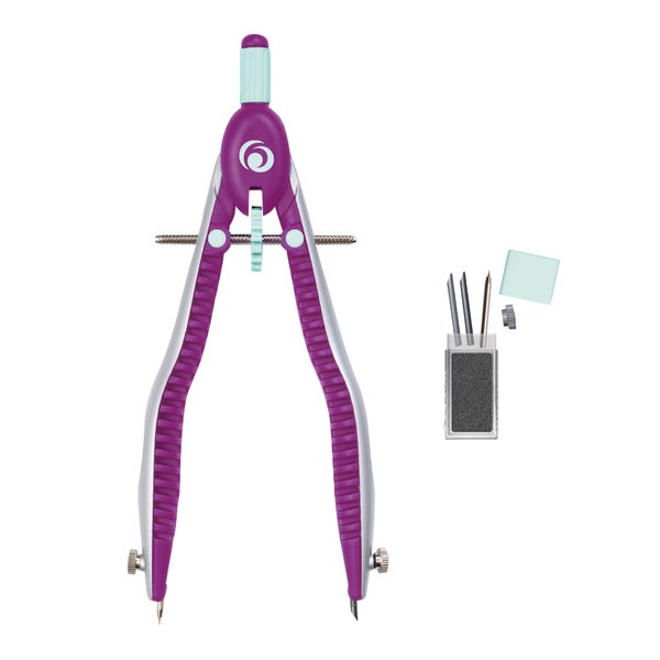 Schnellverstellzirkel inklusiv Ersatzminenbox mit Stellschraube, Ersatzspitze und zwei Ersatzminen, inkl. Anspitzmöglichkeit. Farbe: lila/minze in Hängepackung.