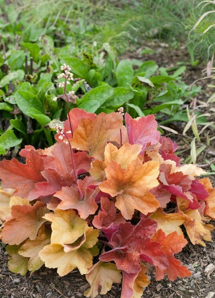 Heuchera micrantha ‘Peach Flambé’ – Purpurglöckchen – ist eine außergewöhnliche Blattschmuckstaude, die mit leuchtenden Apricot- bis Pfirsichtönen und rötlich überhauchten Blättern Akzente im Garten setzt. Die wintergrüne bis halbimmergrüne Staude bildet kompakte, horstbildende Polster mit rundlich gelapptem Laub, dessen Farbspiel über die Jahreszeit wechselt: im Frühjahr intensiv pfirsichfarben, im Sommer wärmer orange bis kupfer, im Herbst oft tiefer rötlich. Von späten Frühlingstagen bis in den Sommer schweben zarte, cremeweiße Blütenrispen auf filigranen Stielen über dem Laub und geben der Beetstaude eine elegante, luftige Struktur. Der Wuchs bleibt angenehm kompakt und dicht, ideal für den Vordergrund im Staudenbeet, den Schattengarten und den Vorgarten.