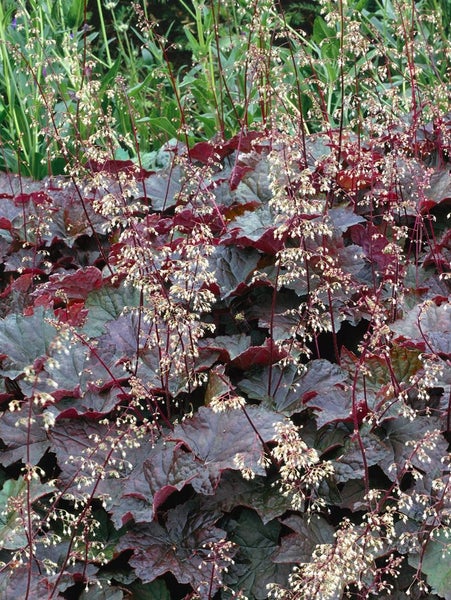 Heuchera micrantha ‘Purple Petticoats’, das Purpurglöckchen, ist eine elegante Blattschmuckstaude, die mit tief gelapptem, stark gewelltem Laub in sattem Purpur bis Schwarzviolett beeindruckt und ganzjährig Struktur ins Beet bringt. Die Blattunterseiten schimmern bordeauxrot, wodurch der Gartenstrauch im Halbschatten besonders lebendig wirkt. Von späten Frühling bis in den Sommer erscheinen zarte, rispige Blütenstände mit zahlreichen kleinen, cremeweißen bis zart rosafarbenen Glöckchen, die die edle Blattschönheit luftig ergänzen. Der horstbildende Wuchs bleibt kompakt und formschön, ideal für den Vordergrund, als Einfassung rund um Wege, am Gehölzrand oder in Gruppenpflanzungen, wo die Staude als flächiger Bodendecker eine ruhige, edle Basis schafft. Auch als Kübelpflanze auf Terrasse und Balkon oder als Solitär im Schattengarten setzt sie stilvolle Akzente und harmoniert hervorragend mit Funkien, Farnen oder Gräsern.
