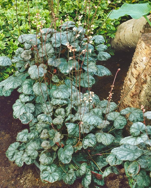 Heuchera x brizoides ‘Pewter Moon’, das Purpurglöckchen, präsentiert sich als elegante Blattschmuckstaude mit außergewöhnlicher Laubwirkung und feinem Blütenflor. Ihre charakteristischen, rundlich gelappten Blätter schimmern in zinnsilbernen Tönen, sind attraktiv marmoriert und von dunklen Adern durchzogen; die Blattunterseiten zeigen oft einen zarten Purpurhauch. Ab späten Frühling bis in den Sommer erscheinen auf filigranen, aufrechten Rispen zahlreiche kleine, hellrosa bis roséfarbene Glöckchen, die über dem kompakten, horstigen Wuchs schweben und der Gartenstaude zusätzlichen Reiz verleihen. Mit einer Höhe von etwa 25–35 cm, den Blütenstielen etwas darüber, bleibt sie formschön und ist ganzjährig, in milden Lagen sogar wintergrün. Als vielseitige Beetstaude eignet sich ‘Pewter Moon’ hervorragend für den Schattengarten und halbschattige Rabatten, für die Unterpflanzung von Gehölzen, als dekorative Randbepflanzung entlang von Wegen und für strukturierende Gruppenpflanzungen. Auch im Kübel auf Terrasse oder Balkon setzt diese Zierpflanze edle Akzente und macht als Solitär ebenso Eindruck wie in Kombination mit Funkien, Farnen oder Astilben. Ein frischer, humoser, gut durchlässiger Boden ohne Staunässe lässt das Purpurglöckchen bestens gedeihen; leicht saure bis neutrale Substrate sind ideal. Ein Platz im Halbschatten bis lichten Schatten fördert die intensive Blattzeichnung, während gleichmäßige, mäßige Feuchte die Blattqualität erhält. Verblühte Stiele können regelmäßig entfernt werden, eine dünne Mulchschicht hält den Wurzelbereich im Sommer kühl und unterstützt den gleichmäßigen Wuchs dieser langlebigen, pflegeleichten Zierstaude.