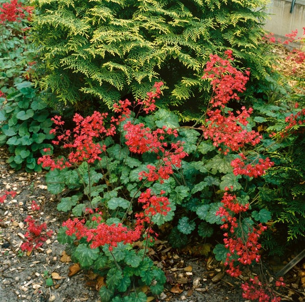 Heuchera x brizoides ‘Pluie de Feu’, das Purpurglöckchen beziehungsweise Korallenglöckchen, begeistert als elegante Blattschmuckstaude mit leuchtenden, feuerroten Blütenrispen, die von Mai bis Juli über dem dichten Laub schweben. Das rundlich gelappte, frischgrüne bis mittelgrüne Blattwerk bildet kompakte, horstige Polster und bleibt oft wintergrün, wodurch die Beetstaude ganzjährig Struktur in Rabatten und Staudenbeete bringt. Die schlanken, aufrechten Blütenstiele setzen intensive Farbakzente und sorgen für Tiefe in der Pflanzung, während der buschige, aufrechte Wuchs eine harmonische, pflegeleichte Gartenstaude ergibt. Als vielseitige Kübelpflanze macht ‘Pluie de Feu’ auf Terrasse und Balkon ebenso eine gute Figur wie im Vorgarten, an Wegrändern und als Einfassung; in Gruppenpflanzung unter Gehölzen oder in Kombination mit Funkien, Farnen und Ziergräsern entstehen attraktive, langlebige Pflanzenbilder. Ein halbschattiger bis absonniger Standort ist ideal, in gleichmäßig frischer, humoser und gut durchlässiger Erde entwickelt sich die Staude besonders vital; Staunässe sollte vermieden, der Boden bei längerer Trockenheit moderat gewässert werden. Ein leichter Rückschnitt verwelkter Blüten sowie das Entfernen älterer Blätter nach dem Winter fördern einen kompakten Neuaustrieb. Eine dezente Startdüngung im Frühjahr reicht aus, um die Blühfreude zu unterstützen. Dank ihrer Robustheit und Winterhärte eignet sich Heuchera x brizoides ‘Pluie de Feu’ als dauerhafte Beetstaude, als Akzentpflanze im Steingarten oder als kleiner Solitär im Schattenbeet und setzt durch ihre intensiven, korallenroten Blüten einen lebhaften, edlen Kontrast zum grünen Laub.