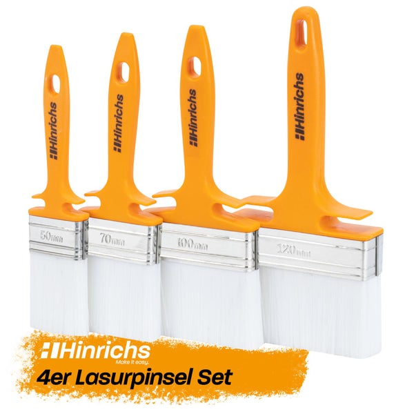DAS PERFEKTE LASUR-SET - Hinrichs 4-Teiliges Lasur- und Lackierpinsel Set in verschiedenen Breiten von 50 mm, 70 mm, 100 mm und 120 mm.