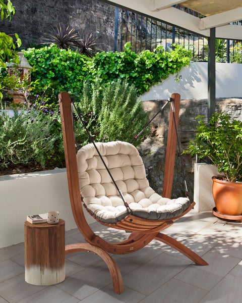 Rustikale Lärchenholz-Gartenschaukel mit passender Auflage. Mit dieser Schaukel genießen Sie puren Komfort und eine atemberaubende Wohlfühlatmosphäre auf ganzer Linie. Der Hängesessel ist nicht nur aus festem, geöltem Lärchenholz gefertigt, sondern auch mit einem robusten Seil und Karabinern ausgestattet. Mit den Karabinern lässt sich die Sitzschale problemlos anbringen und abnehmen, was sehr praktisch ist, wenn man die Schaukel zwischendurch warten möchte. Zudem wird die Holzschaukel mit einem äußerst dicken, gesteppten Stoffkissen geliefert. Das Besondere an dem Kissen: Man kann es bei Bedarf wenden, sodass Sie zwischen einer dunklen oder hellen Oberfläche wählen können und so den Look Ihres Außen- oder Innenbereichs leicht verändern können. Details: Typ Gartenschaukel. Farbe: Braun. Farbton: Hellbeige. Material: Holz. Material: Lärchenholz. Zusätzliches Material: Stoff. Zusammenstellung: 100% Polyester. Finish: Geölt. Abmessungen: Tiefe: 100 cm. Sitzhöhe: 45 cm. Breite: 125 cm. Höhe: 142 cm. Sitzfläche: 55x70 cm. Gewicht: 27 kg. Max. Belastung: 120 kg. .Sie kaufen: 1 x Sitzkissen, 1 x Hollywoodschaukel. Produktvorteile: Ausgezeichneter Platz zum Entspannen, Modernes Design, UV-Beständigkeit, Damit die Qualität des Artikels erhalten bleibt, sollte er vor Wasser und Regen geschützt werden, Stabile Konstruktion des Gestells. Montage: Nicht montiert.45 - 60 Min. Zusatzinformationen: Holz ist ein Naturprodukt. Farb- und Strukturunterschiede, Narben, Falten und sonstige Naturmerkmale sind Echtheitsbeweise und keine zur Reklamation berechtigende Fehler. Beständigkeit: UV-beständig. Beständigkeit Text: UV-strahlenbeständige Möbel weisen eine erhöhte Beständigkeit gegen Verblassen oder Verfärbung auf. Wir empfehlen jedoch, dass Sie das Produkt bei Nichtgebrauch abgedeckt aufbewahren. Dies gewährleistet die maximale Lebensdauer der Möbel. Pflegeanleitung: Lärchenholz: 1.Bitte ausschließlich milde Reinigungsmittel und weiche Tücher verwenden. Dabei immer in Richtung der Maserung abwischen. Feuchte Stellen sofort mit einem weichen Tuch trocken reiben und Dauernässe bei der Reinigung vermeiden. 2.Geöltes Holz sollte vor der Benutzung und nach der Saison vor der Einlagerung nachgeölt werden, besonders bei feuchtem Klima. 3.Wir empfehlen bei ungünstigen Witterungsbedingungen und für die Wintersaison eine Schutzabdeckung zu verwenden oder, wenn möglich, die Gartenmöbel trocken und kühl drinnen zu lagern. Stoff: 1.Flecken können mit einem Polsterreiniger, einem angefeuchteten Schwamm oder milden Reinigungsmitteln entfernt werden. 2.Oberflächen nur mit geeignetem Aufsatz vorsichtig absaugen. 3.Wenn die Textilien nicht verwendet werden, sollten sie an einem sauberen und trockenen Ort vor ungünstigen Witterungseinflüssen geschützt werden.
