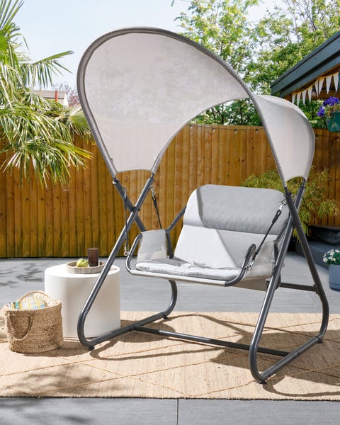 Hollywoodschaukel mit Mesh-Dach. Genießen Sie friedliche Momente in Ihrem Garten mit dieser stilvollen und klassischen Schaukel, die für Entspannung sorgt und für eine Person geeignet ist. Der stabile, pulverbeschichtete Stahlrahmen garantiert Langlebigkeit, während die weiche Sitzfläche für Komfort sorgt. Ein Mesh-Dach bietet genau den richtigen Schatten, sodass Sie die frische Luft und sanfte Schwingbewegung genießen können. Mit ihrem schlichten Design fügt sich diese Schaukel perfekt in jeden Außenbereich ein. Details: Typ Gartenschaukel. Farbe: Grau. Farbton: Hellgrau. Material: Metall. Material: Stahl. Zusätzliches Material: Stoff. Zusammenstellung: 100% Polyester. Finish: Pulverbeschichtet. Abmessungen: Tiefe: 117 cm. Sitzhöhe: 46 cm. Breite: 114 cm. Höhe: 182 cm. Sitzfläche: 73x55 cm. Gewicht: 20 kg. Max. Belastung: 120 kg. .Sie kaufen: 1 x Hollywoodschaukel, Kissen sind im Lieferumfang enthalten. Produktvorteile: Ausgezeichneter Platz zum Entspannen, Moderne Terrassen- und Gartenmöbel, Stabile und solide Konstruktion, Wasserdicht dank hochwertiger Materialien, UV-Beständigkeit Klasse 6 (ISO 105-B02). Montage: Nicht montiert.20 - 40 Min. Beständigkeit: Rostbeständig, Schmutzbeständig, Wasserbeständig. Beständigkeit Text: Dank eines entsprechenden Finish zeichnet sich das Produkt Oberfläche durch eine Rostbeständigkeit aus. Dies bedeutet, dass es im Freien genutzt werden kann. Werden die Möbel nicht genutzt, sollte entweder eine Abdeckung verwendet oder sie sollten an einem trockenen Ort gelagert werden. Das Produkt wurde aus Materialien gefertigt, die eine hohe Fleckenbeständigkeit aufweisen, weshalb es zu keinen Verfärbungen kommen sollte oder diese leicht zu beseitigen sind. Bei der Fleckenentfernung sind die Pflegehinweise zu berücksichtigen. Dieses Produkt zeichnet sich durch eine hohe Wasserbeständigkeit aus. Dies bedeutet, dass es in Kontakt mit Regen oder anderen Flüssigkeiten nicht beschädigt wird. Sie können das Produkt im Freien, auch bei Regen oder einer hohen Luftfeuchtigkeit nutzen. Außerhalb der Saison sollte das Produkt bedeckt und an einer abgedachten Stelle aufbewahrt werden. Pflegeanleitung: Stahl: 1.Um die Haltbarkeit Ihrer Gartenmöbel zu verlängern, sollten sie stets vor Feuchtigkeit geschützt und regelmäßig gereinigt werden. 2.Die Reinigung kann mit handelsüblicher milder Seifenlauge erfolgen. 3.Um den Korrosionsschutz des Metalls zu gewährleisten, vermeiden Sie den Kontakt mit säurehaltigen Reinigungsmitteln oder Mitteln mit basischen Komponenten. 4.Wenn das Möbelstück nicht verwendet wird, sollte es im Innenbereich gelagert oder mit einer Schutzhülle abgedeckt werden. 5.Falls vorhanden, Schutzkappen in regelmässigen Abständen lösen, etwaige rostigen Ausflüsse austreten lassen, die unbehandelte Innenseite der Gartenmöbel gründlich austrocknen lassen und ev. Korrosionsschutz-Spray verwenden. 6.Jegliche Schäden an der Außenfarbe sollten vor Feuchtigkeit geschützt werden. 7.Bitte beachten Sie, dass dieses Möbelstück nicht mit Wasser in Kontakt kommen sollte, da dadurch rostiges Wasser aus dem Inneren der Rohrrahmen austreten könnte. 8.Zweimal im Jahr mit einem Versiegelungsmittel oder Rostschutzmittel behandeln, um die Lebensdauer der Möbel zu verlängern. Stoff: 1.Flecken können mit einem Polsterreiniger, einem angefeuchteten Schwamm oder milden Reinigungsmitteln entfernt werden. 2.Oberflächen nur mit geeignetem Aufsatz vorsichtig absaugen. 3.Wenn die Textilien nicht verwendet werden, sollten sie an einem sauberen und trockenen Ort vor ungünstigen Witterungseinflüssen geschützt werden. Mesh: 1.Flecken können mit einem Polsterreiniger, einem angefeuchteten Schwamm oder milden Reinigungsmitteln entfernt werden. 2.Oberflächen nur mit geeignetem Aufsatz vorsichtig absaugen. 3.Wenn die Textilien nicht verwendet werden, sollten sie an einem sauberen und trockenen Ort vor ungünstigen Witterungseinflüssen geschützt werden.