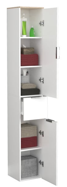 Der VCM Hochschrank Donali fügt sich in jedes Badezimmer perfekt ein, weshalb sich der Designer bewusst für schlichte Drehtüren und eine schlichte Schublade entschieden hat. Die melaminbeschichtete Oberfläche macht das Möbel besonders pflegeleicht und unempfindlich gegenüber Feuchtigkeit.