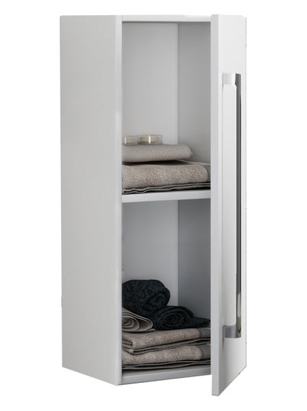 Die Drehtür hat einen Griff in Alu-Optik aus Metall, was dem Möbel einen besonderen Stil verleiht. Ein Fachboden schafft die perfekte Unterteilung für den geschlossenen Stauraum.
