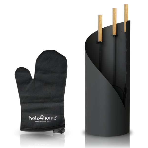 holz4home 5tlg. Kaminbesteck Grauschwarz mit Holzgriff inkl. Ofenhandschuh