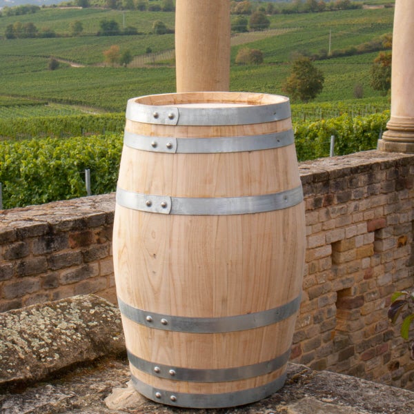 150 l Deko-Holzfass aus unbehandeltem Kastanienholz – Verwenden Sie diese zum Beispiel als Tisch oder Barhocker.