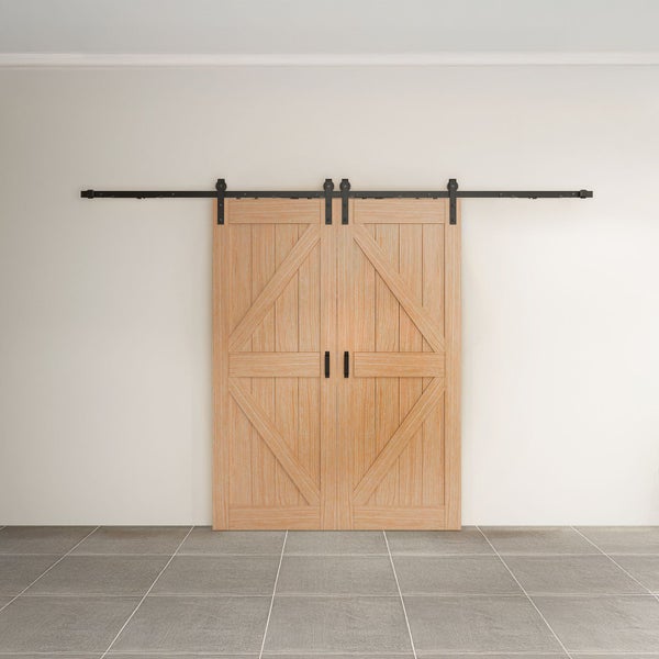 Doppelflügelige Holzschiebetür Scheunentor mit Laufschiene in schwarz