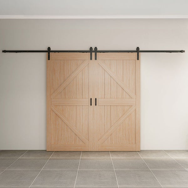 Doppelflügelige Holzschiebetür Scheunentor mit Laufschiene in schwarz