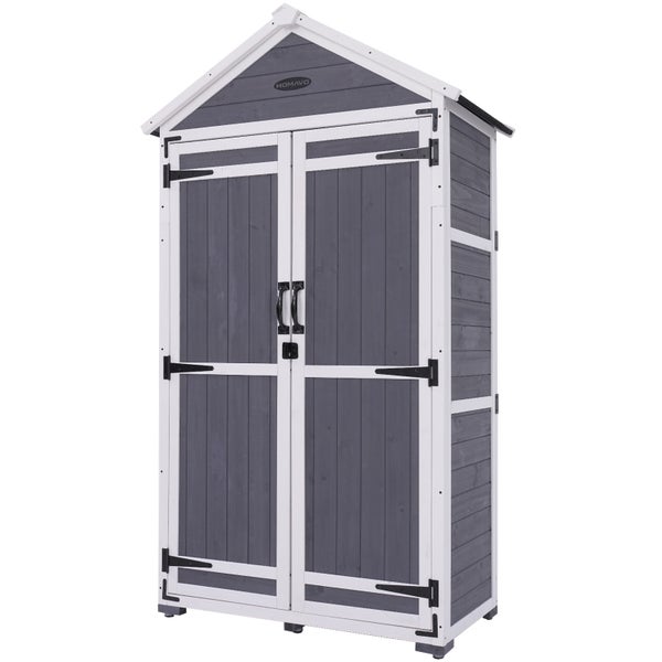 Die Gesamtabmessungen des Gerätehaus Holz betragen 99,3*56,5*178 cm. Das Innere ist mit dreistufigem Stauraum