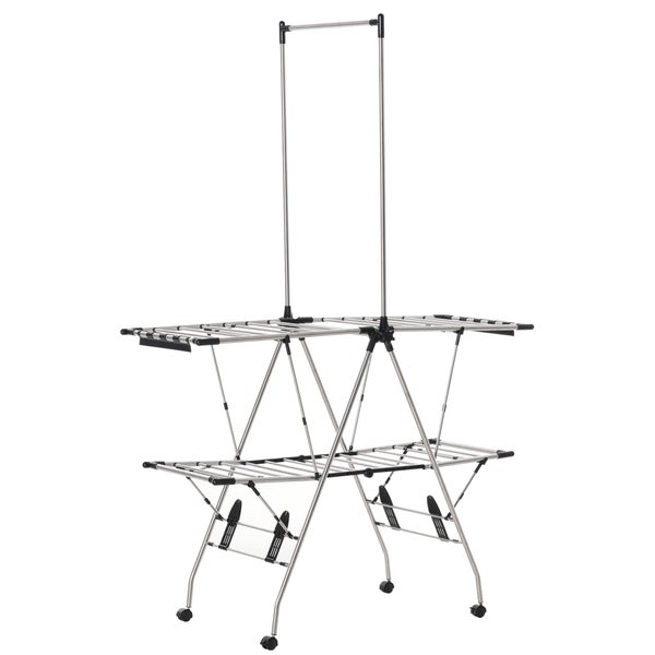 Dieser Ausziehbarer Wäscheständer von HOMCOM verfügt über 3 Ebenen, um ihrer Wäsche aufzuhängen. Dank seiner stabilen Pyramidenform verfügt er über einen sicheren und stabilen Stand. Auf der oberen Kleiderstange lassen sich gut lange Kleidungsstücke aufhängen. Bei Nichtgebrauch lässt sich der Wäscheständer leicht zusammenfalten. Durch sein kompaktes Design lässt er sich auch gut auf den Balkon stellen.