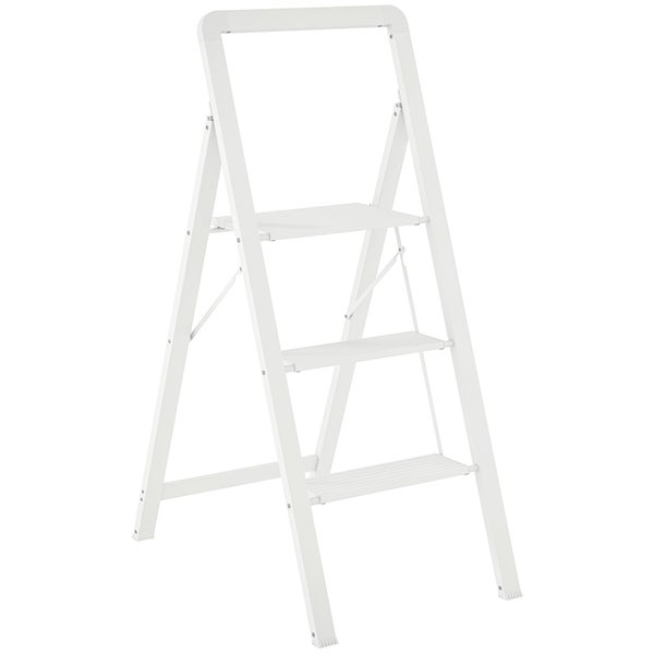 HOMCOM Trittleiter 3 Stufen klappbar Alu-Leiter mit Breitem Anti-Rutsch-Matten Tragbare Stehleiter bis 150 kg belastbar Klapptritt für Haushalt Büro Garage, Haushaltsleiter Weiß