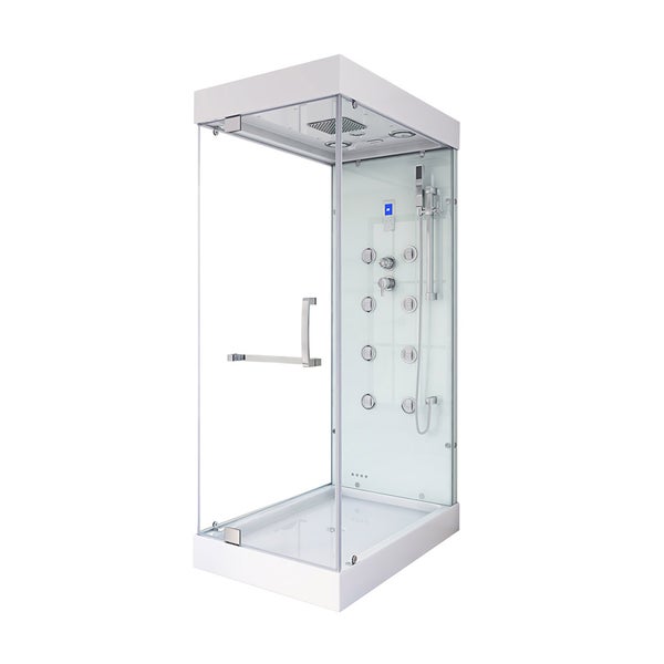 Verliere zum Beispiel nach einem mühsamen Arbeitstag deinen Stress bei einem angenehmen Dampfsaunagang (bis 40 °C einstellbar), bei dem du garantiert ins Schwitzen kommst. Unsere Design-Serie verfügt außerdem über die Regenbrausenoption, bei der das Wasser wie ein lauwarmer Tropenregen aus dem Deckenhimmel rieselt. Eine entspannte Rückenmassage (8 Hydrojets) mit gleichzeitigem Lauschen deines Lieblingsradiosenders ist bei vielen Kunden beliebt. Selbstverständlich ist auch der gewöhnliche Gebrauch über eine Handbrause, die über die befestigte Duschstange justierbar ist, möglich. Die 7 blauen LED-Lichter im Deckenhimmel machen den Wohlfühlfaktor vollkommen. Genieße die exotische Duschatmosphäre. Über das integrierte Computerdisplay kannst du die Lautstärke und Senderwahl stufenlos regeln. Sowohl die Kombination aus 5 mm klarer und weißgetönter ESG-Vollverglasung aller Komponenten als auch die Aluminium-Rahmenkonstruktion stehen für den durchweg hohen Qualitätsstandard. Optisch wird durch die helle Konzeption des Designs mehr Räumlichkeit geboten. Die auf fast jeden Untergrund anzupassenden höhenverstellbaren Füße der Duschwanne sind ein weiteres herausragendes Feature, das diese Dusche von anderen hervorhebt.