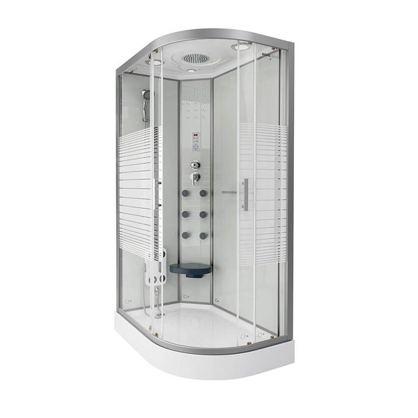 Unsere „PEARL-Serie“ bietet Ihnen die Regenduschen-Variante, bei der Wasser wie lauwarmer Tropenregen aus den unglaublichen 126 Düsen im Deckenhimmel rieselt. Eine entspannende Rückenmassage (6 Hydrojets) beim Hören Ihres Lieblingsradiosenders erfreut sich bei vielen Kunden großer Beliebtheit. Selbstverständlich ist auch die normale Nutzung mit einer Handbrause möglich, die sich über die angebrachte Brausestange verstellen lässt. Die Handbrause verfügt über 3 verschiedene Strahlvarianten, sodass Sie die Strahlstärke je nach Bedarf anpassen können. Die 15 blauen LED-Leuchten im Mittelteil runden den „Wohlfühlfaktor“ ab. Über das integrierte Computerdisplay können Sie die Lautstärke und die Senderauswahl stufenlos anpassen. Der Klappsitz im Mittelteil und die Anti-Rutsch-Struktur im Wannenboden sorgen für eine sichere Nutzung dieser Duschkabine. Sowohl die 4 mm ESG-Vollverglasung aller Bauteile als auch die hochmoderne Teilsatinierung stehen für unseren gleichbleibend hohen Qualitätsanspruch. Ein weiteres herausragendes Merkmal, das diese Duschkabine von anderen abhebt, sind die höhenverstellbaren Füße der Duschwanne, die sich an fast jeden Untergrund anpassen lassen.
