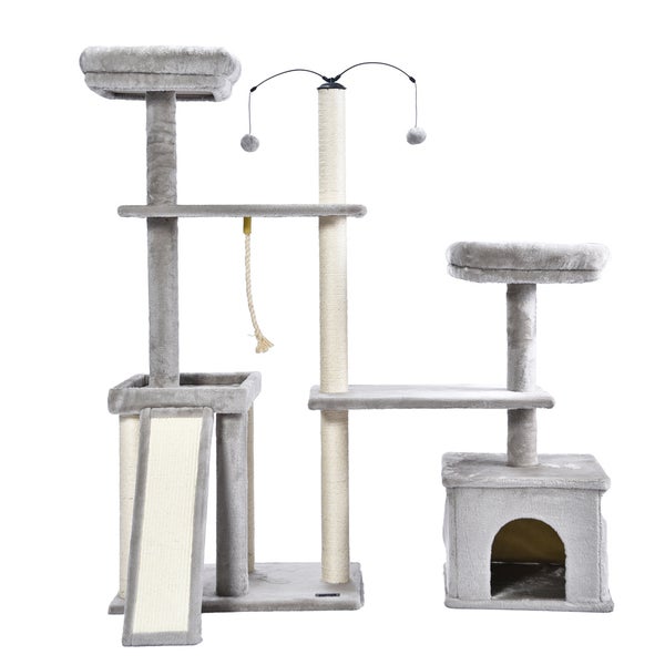 Das moderne Design fügt sich nahtlos in jedes Interieur ein und bietet Ihrem Haustier einen gemütlichen und stilvollen Ort zum Entspannen und Spielen. Hergestellt aus hochwertigem Polyester und robustem Sisal bietet dieser Kratzbaum die ideale Kombination aus Komfort und Kratzfläche. Ihre Katze kann nach Herzenslust ihre Krallen schärfen und ihrem natürlichen Kratzbedürfnis nachgehen. Unser Kratzbaum ist mit abnehmbaren Seitenwänden an den Häusern und der Liegefläche ausgestattet. Dadurch können Sie den Kratzbaum individuell an die Vorlieben Ihrer Katze anpassen und ihr verschiedene Rückzugsmöglichkeiten bieten. Ob es sich um einen geschützten Rückzugsort oder einen erhöhten Aussichtspunkt handelt, Ihre Katze wird es lieben, verschiedene Bereiche zu erkunden und sich bequem auszuruhen. Als Bonus liegt dem Kratzbaum ein Spielzeug bei, das den Jagdinstinkt Ihrer Katze weckt und für stundenlangen Spielspaß sorgt.