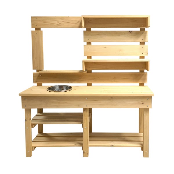 Der Stauraum bietet zudem die Möglichkeit, die Küche sauber und ordentlich zu halten. Durch den Einsatz im Außenbereich können Kinder mit Materialien spielen, die in den eigenen vier Wänden vermieden werden und die Wohnungseinrichtung somit geschont wird. Das Holz ist mit einer Farbe auf Wasserbasis behandelt und enthält daher keine Öle oder Chemikalien.