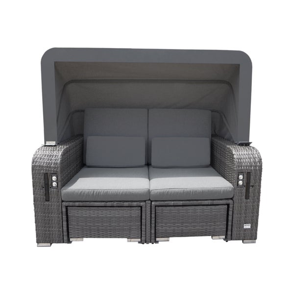 Dieses Flair und mehr bietet die Strandkorbliege HOLBY, ohne dafür bis an die Nordsee fahren zu müssen. Genießen Sie den Komfort eines Strandkorbs mit extra dicken Kissen und einer himmlisch bequemen Liegefunktion. Ob im Wintergarten, aus der Terrasse, dem Balkon oder im Garten ist HOLBY mit seinem exklusiven Design ein echter Hingucker und lädt zum Sonnenbaden oder Verweilen ein. Im Grundzustand sieht HOLBY aus wie ein besonders gemütliches Designer-Doppelsofa. Und hier verbirgt sich der Deluxe Faktor: Die freistehenden, versteckt integrierten Hocker erweitern die Liegefläche oder können als zwei zusätzliche Sitzgelegenheiten genutzt werden. Per Knopfdruck lässt sich die Liegefläche durch geräuschlose Gasdruckfedern ausfahren, komplett ohne Stromanschluss. Das praktische Sonnendach kann kinderleicht aufgestellt werden, und die beiden integrierten Ablageflächen bieten nach dem Ausfahren Platz für Ihr Lieblingsbuch oder ein eisgekühltes Getränk. All diese Funktionen können Sie frei kombinieren, um Ihr individuelles und persönliches Stückchen Strandurlaub in den eigenen Garten zu holen. Die Strandkorbliege ist aus modernem und ansprechendem PE-Rattan gefertigt. Sie widersteht somit jeder Witterung und ist dabei besonders pflegeleicht. Die herausfahrbare Erweiterung der Liegefläche ist geräuschlos, Strom - und wartungsfrei. Die extra dicken und stabilen Kissen überstehen auch Nächte im Freien oder Regen, sollten aber für ein langfristiges Vergnügen trocken gelagert werden. Ansonsten können Sie die gesamte Strandkorbliege auch mit unserer separat erhältlichen Abdeckung vor Witterung und Nässe schützen. Das Sonnensegel aus Kunstfaser sorgt wie eine Strandmuschel für angenehmen Schatten und schützt vor unangenehmem Luftzug.